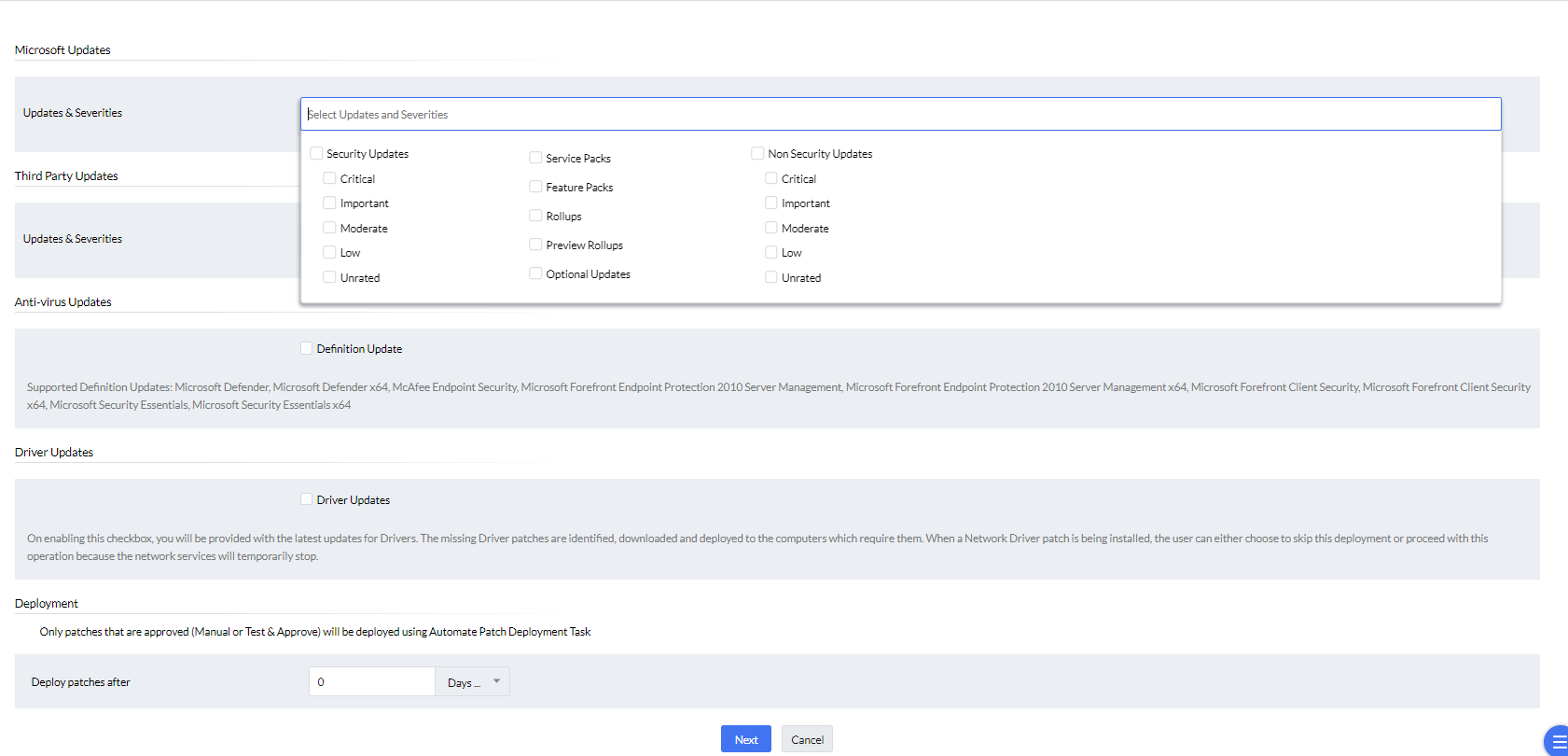בחלון זה ניתן לסמן את סוגי העדכונים הרצויים לפי Severity וסוג פאץ'.