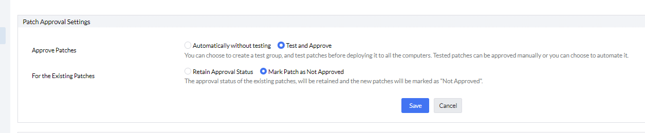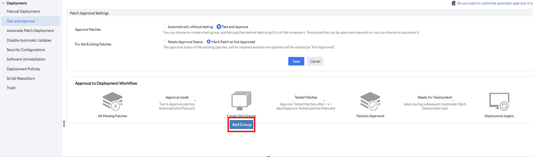 ניתן להחליף את תהליך העבודה לקבוצת ביקורת (Test and approve), בו פאצ'ים חדשים יסומנו בדגל אדום (Not approved), עד שיותקנו בהצלחה על המחשבים שנגדיר בקבוצת הביקורת, ססטוס האישור שלהם ישתנה לירוק, ויהיה להם אישור להתקנה רחבה באוטומציה.