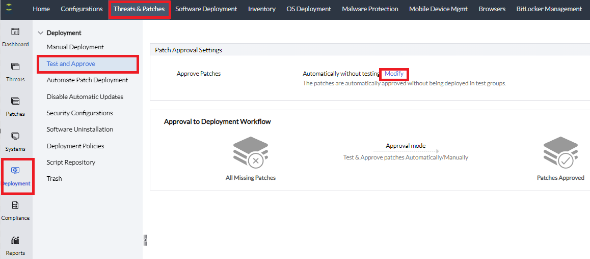 נלחץ על הנתיב הבא: Threats & patches -> deployment -> test and approve -> modify