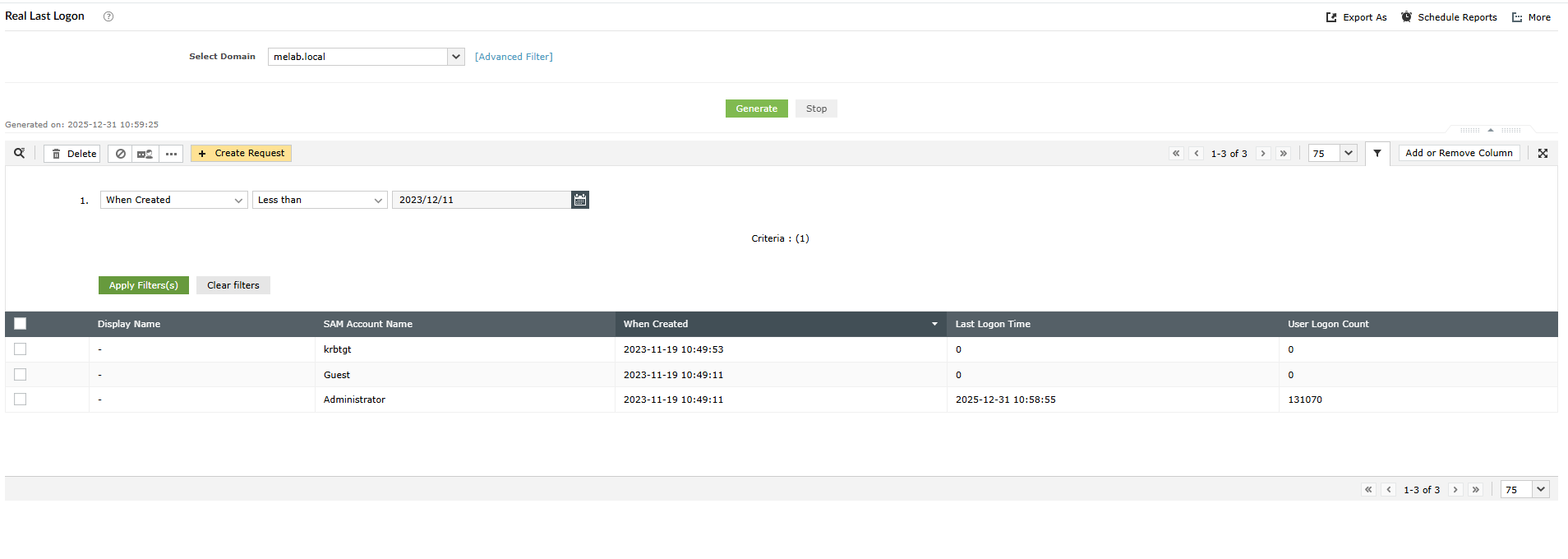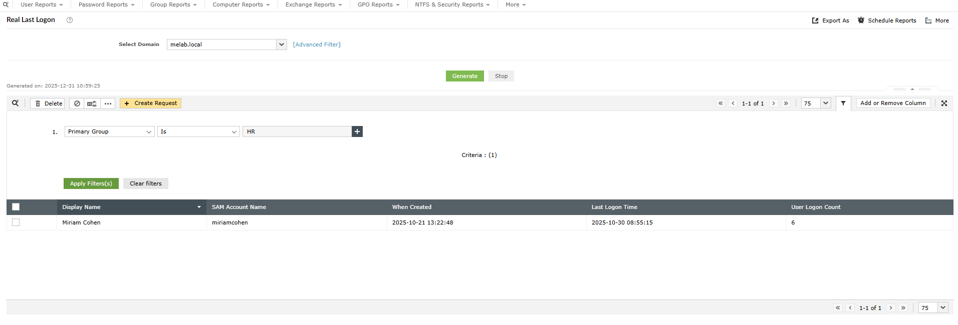 דו"ח עבור חיבור אחרון של משתמשים (Last Log On)