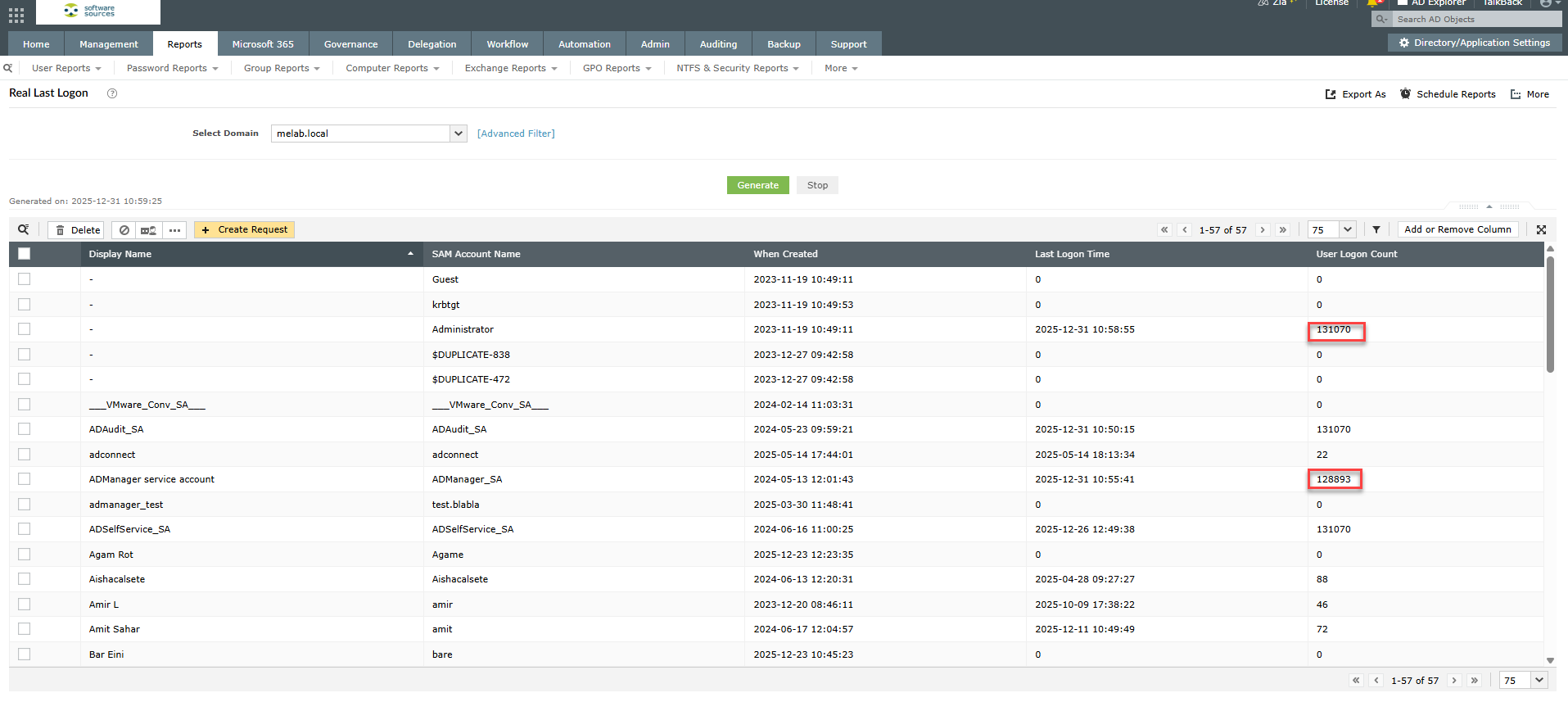 כאן נקבל תמונת מצב של כלל המשתמשים. ניתן לראות שחשבונות שירות (service accounts) יהיו במספר התחברויות גבוה.