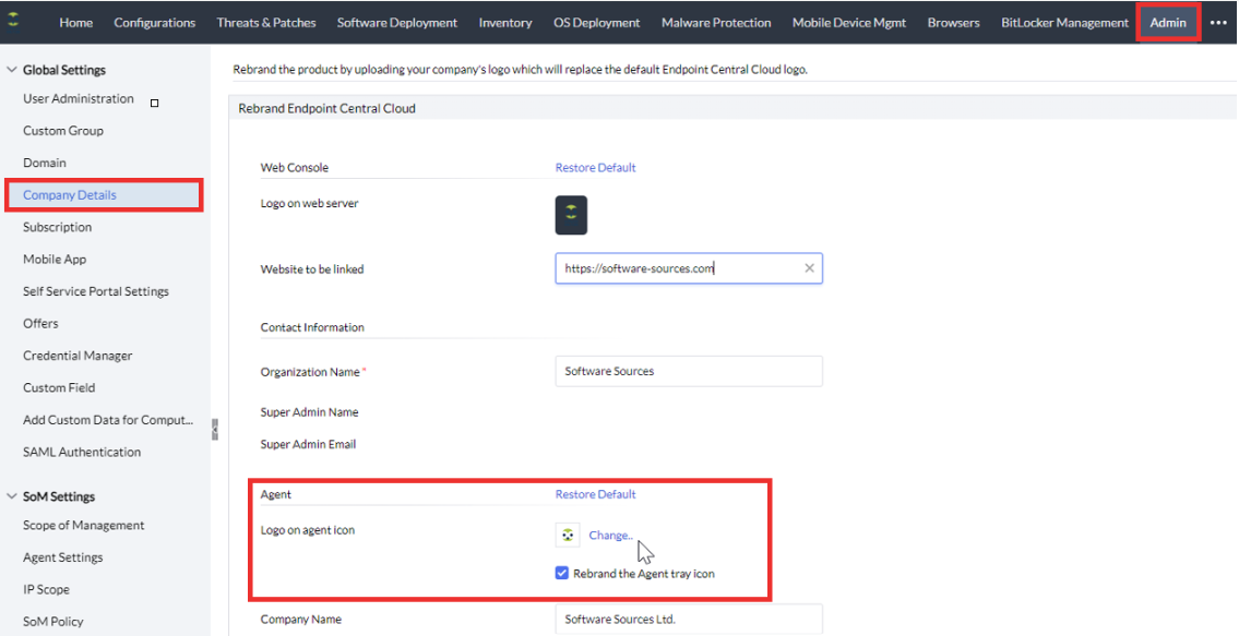 כדי לשנות את סמל הלוגו, נלחץ על המילה "Change" שמופיעה בחלק המסומן באדום, נטען את האייקון הרצוי, ונסמן "Rebrand the agent tray icon"