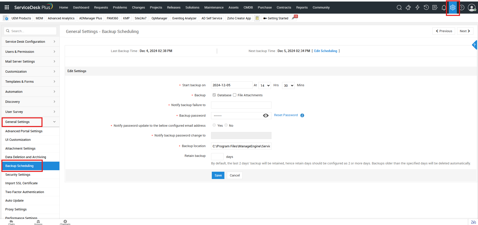 ניתן להגדיר גיבוי אוטומטי במערכת ServiceDesk, שיתבצע מחוץ לשעות הפעילות ויאוחסן בתיקייה בשרת.