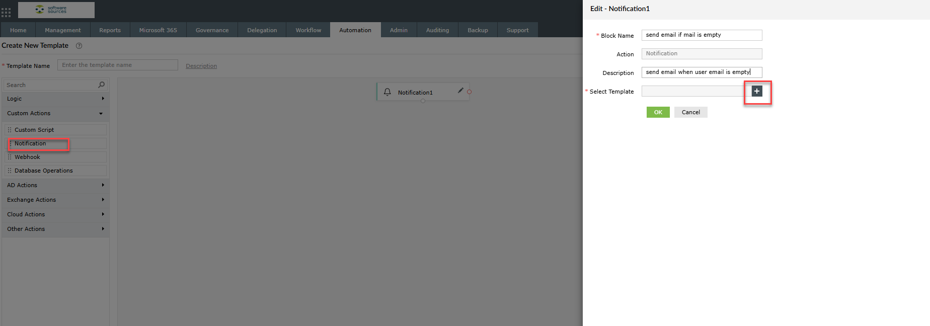 נבחר בפעולה שנרצה שתתבצע - במקרה זה, שליחת התראה. ולאחר מכן נלחץ על ה + הקטן ליד select template
