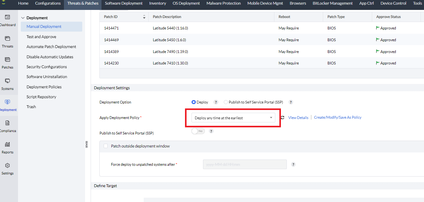 ניתן לעקוב אחר סטטוס המשימות הידניות בנתיב Threats & Patches-> deployment-> manual deployment