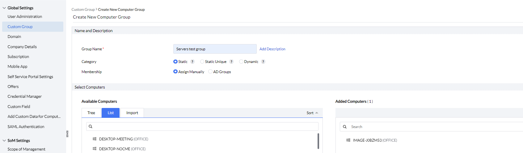 בשלב הראשון נרצה ליצור קבוצה שתכלול את השרתים בארגון, על ידי יצירת custom group מתאים (מפורט גם במדריך - "יצירת קבוצה").