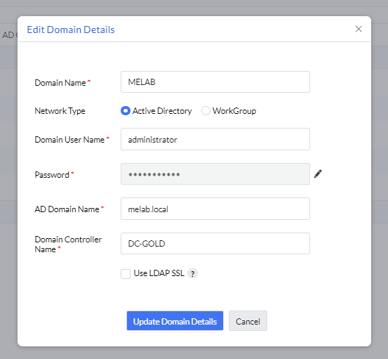 בחלון שייפתח, נמלא את פרטי הדומיין, סוג תקשורת Active directory, ונזין שם משתמש וסיסמא של משתמש בעל הרשאות read ל-AD.