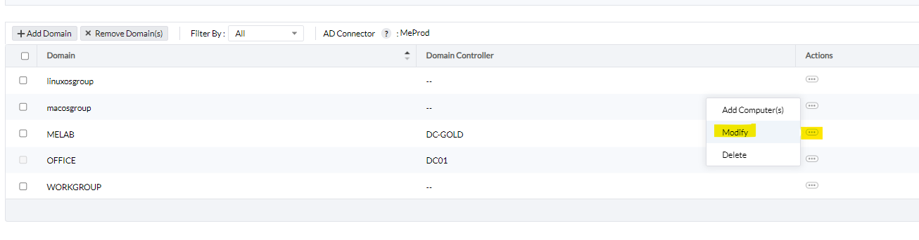 נאתר את הדומיין הרלוונטי למשתמשים שנרצה לייבא מה-AD, ונלחץ על Action-> modify: