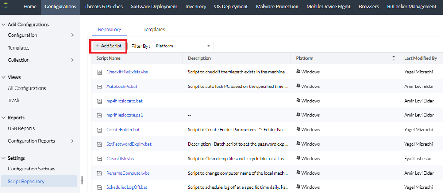 4. לאחר שנשמור את המידע, הסקריפט יופיע כחלק ב- Script repository ויהיה ניתן להשתמש בו במשימה ישירה (Configurations->custom script), או כחלק ממדיניות הפצה(pre/post deployment activity)