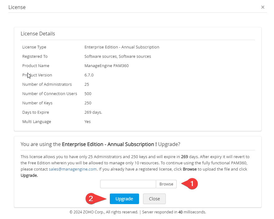 2) בחלון שנפתח נלחץ Browse ונבחר את קובץ ה xml (רשיון) ולאחר מכן נבחר Upgrade.