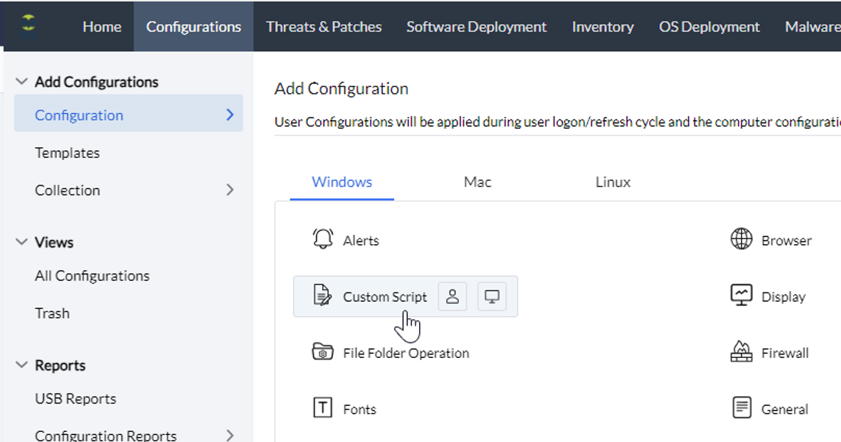 נלחץ על הנתיב הבא: Configurations->templates, נבחר מערכת הפעלה רצויה, ונראה אילו סוגי משימות ניתן להחיל על אותן מערכות.