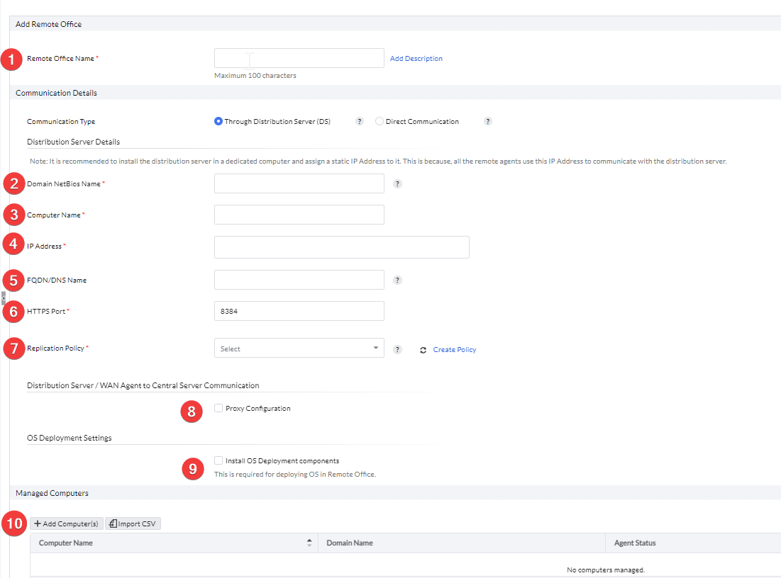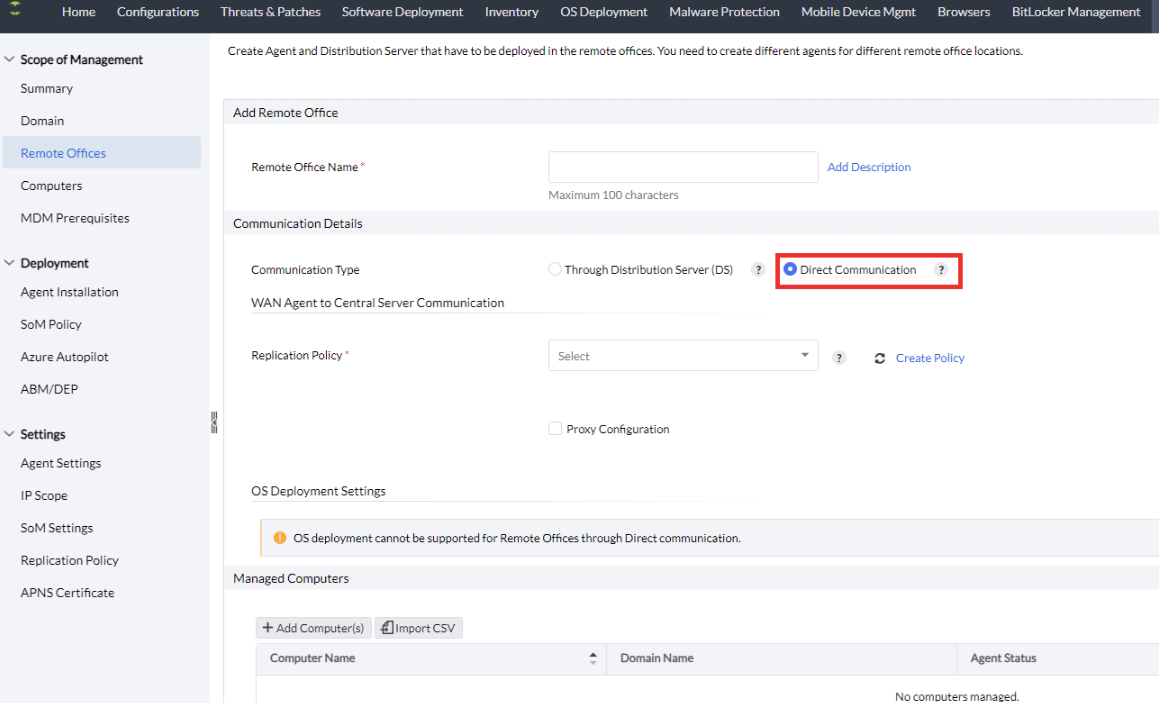 עלינו להגדיר רק את שם האתר המרוחק, את מדיניות ההפצה (דיפולטיבית במערכת), ואת המחשבים שנרצה לקשר לאתר (Managed computers-> add computers)