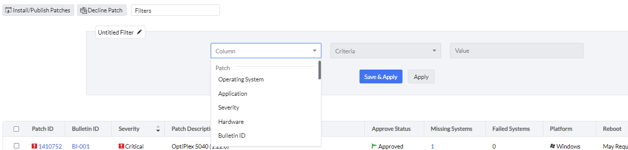 בחלון Column ניתן לבחור את השדה לפיו נרצה לסנן את המידע שמופיע בתצוגה על פי סוג מערכת הפעלה, דומיין, אתר המחשב, סוג העדכונים, ועוד.