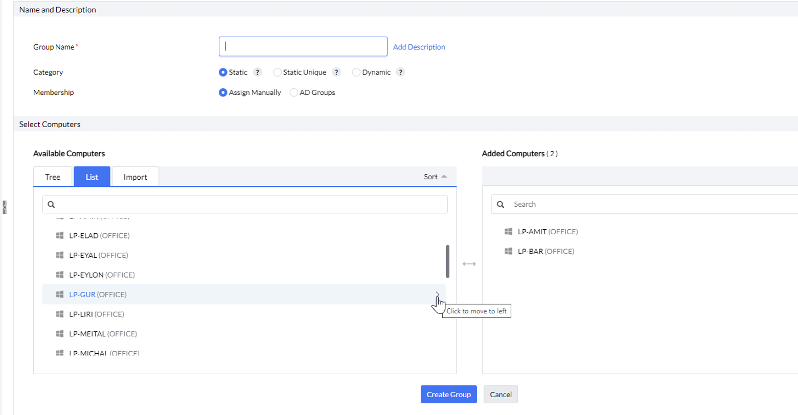 הקטגוריה הראשונה היא Static, בה ניתן להגדיר קבוצה באופן ידני, או לפי דומיין / OU אם הוא הוגדר לפני. אין הגבלות על מחשב להיות חבר בכמה קבוצות במקביל.