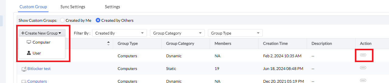 ניתן לערוך את הקבוצות בלחיצה על כפתור Action (מסומן בצילום), או להקים קבוצה חדשה של מחשבים או משתמשים, ע"י לחיצה על כפתור "Create new group":