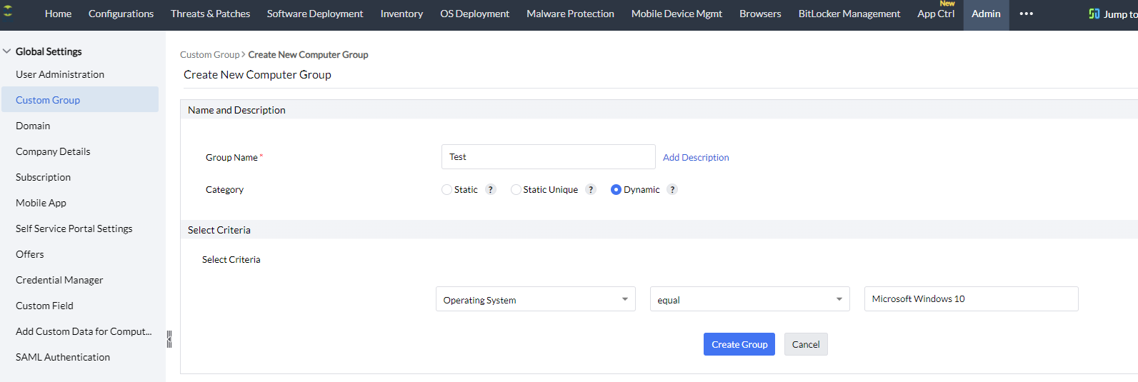 הקטגוריה השלישית ביצירת קבוצה היא "Dynamic", קבוצה זו תיווצר ותתעדכן אוטומטית לפי הקריטריון הקבוע בה. לדוגמה: תחום IP, סוג מערכת הפעלה, קיום של תוכנה מסוימת, ועוד.