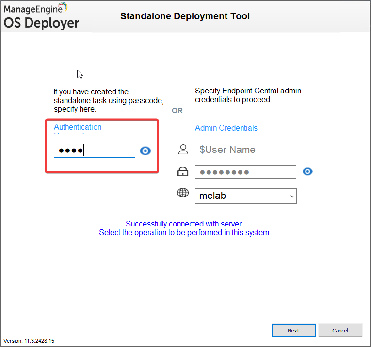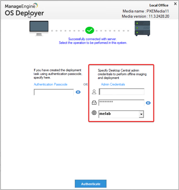 - כשתחנת הקצה עולה נגיע ל OS Deployment Wizard ונזין שם משתמש וססמא של משתמש במערכת OS Deployer \ Endpoint Central.