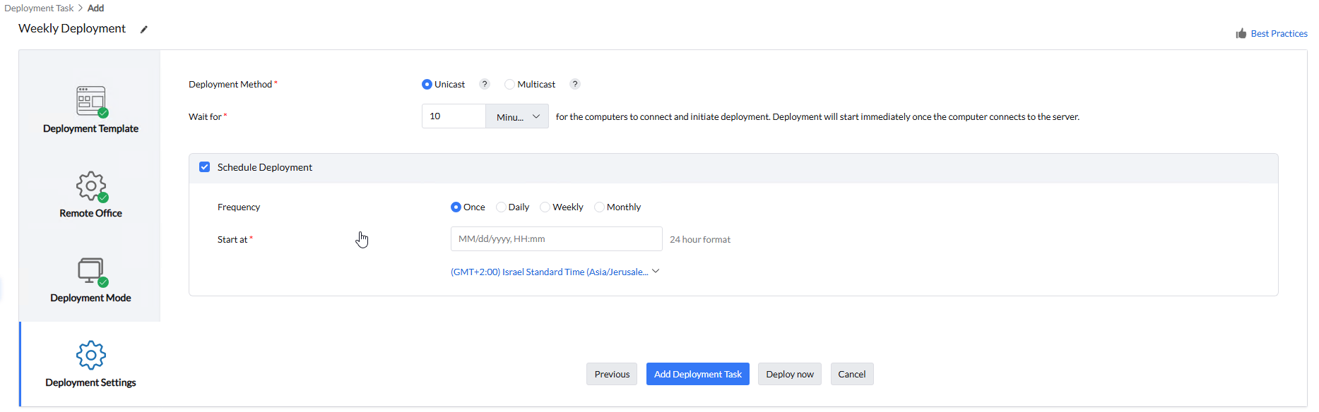 ב. Schedule Deployment - ניתן לתזמן את ההפצה בתדירות יומית, שבועית, חודשית או שנתית. - לבסוף נלחץ על Add Deployment Task \ Deploy Now.