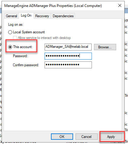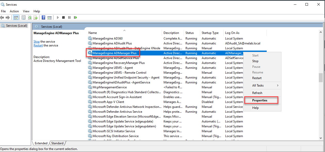 א. יש להכנס לחלון services בשרת ולחפש את הservice של המערכת שנקרא ManageEngine ADManager Plus ולהכנס לproperties.