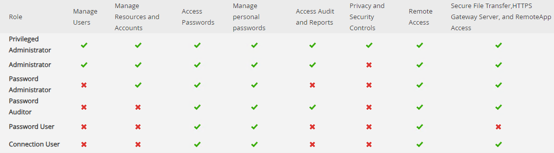 Password Users - משתמשי קצה, משתמשים היכולים רק לצרוך ולראות את המשאבים והססמאות ששותפו איתם בלבד עד ידי אדמין, מספר משתמשים זה אינו מוגבל במערכת.