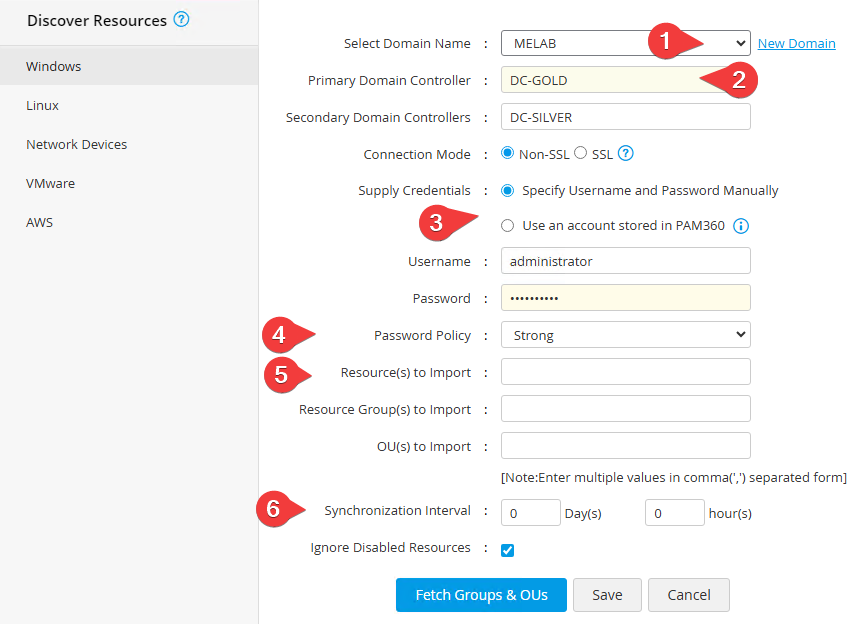 לביצוע פעולות אלה יש לספק למערכת משתמש עם הרשאות אדמין בשרתים.- במערכת ניגש ל Resources -> Discover Resources -> Windows ונקבל את העמוד הבא