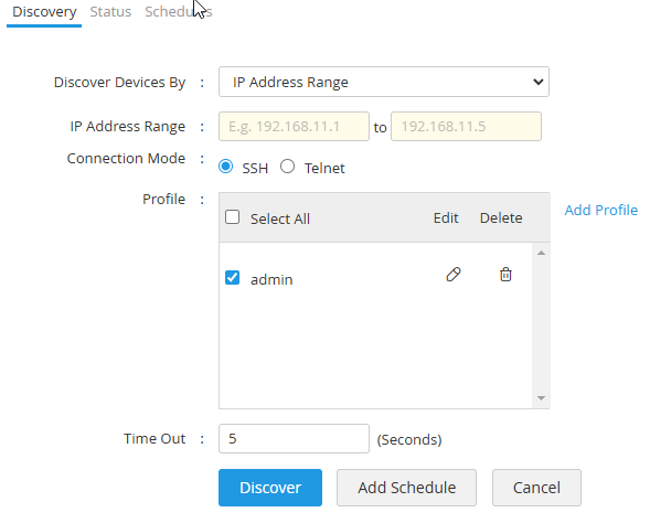 א) Discover Devices By - אפשרות לסרוק כתובת IP אחת, טווח כתובות או מקובץ המכיל את המידע.