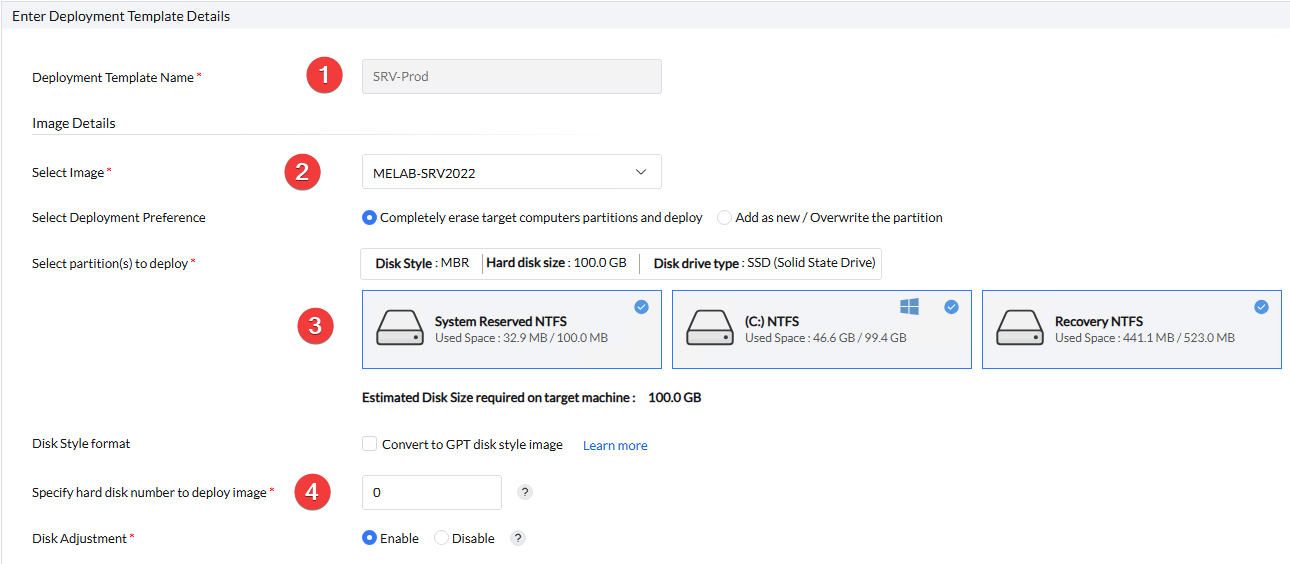 Select partitions to deploy : יש לבחור את החלקים בדיסק אותם נרצה לכלול בתבנית.